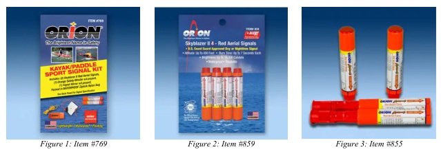 Recall of Orion Distress SignalsPosted December 29, 2025-The manufacturer of the Orion Skyblazer II Red XLT Aerial Signal issued a recall for specific devices due to three (3) incidents of spontaneous combustion. Subsequently, the U.S. Coast Guard has issued Marine Safety Alert 21-25 to inform mariners and anyone who may have the distress signals in their posession or onboard their vessels. For more information and what to do if you have these signals, here is a link to Orion Signals' recall page.